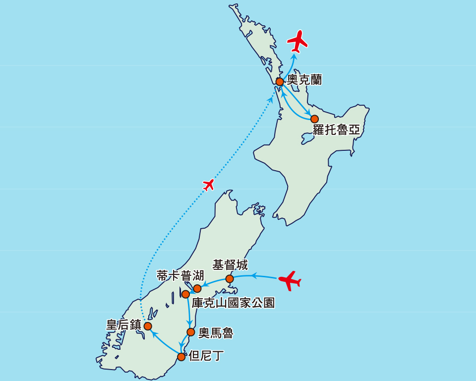 奧克蘭 :新西蘭最大的城市兼交通樞紐。人口約 150 萬,是世界上波利尼西亞人最多的地方。走在奧克蘭市區裡,既能見到高端設計師精品店,又能找到售賣奇珍異寶的露天集市,還可到形形色色的咖啡館和餐廳小坐享用國際美食。有機會還可到中央公園、伊甸山感受奧克蘭的自然氣息。