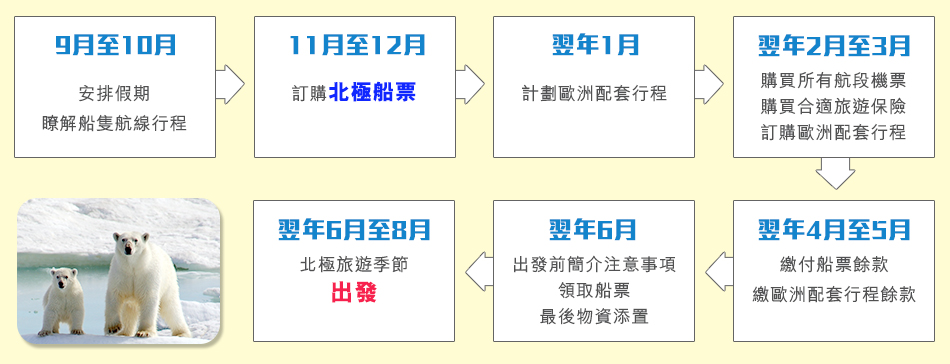 - 極地旅遊的方式和過程跟一般旅行團不同,是一種心靈上的享受,計劃前往極地旅遊前,請先搜集資料或向我們的極地專員查詢,避免帶著不實際的期望前往。