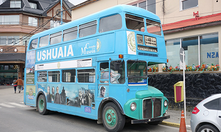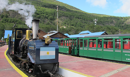 早餐後乘車參觀火地島國家公園,這是阿根廷唯一一個沿海岸線設立的國家公園,園內布滿高高低低的櫸樹、河流、沼澤與湖泊。可乘搭「世界盡頭號」火車通往被視為全世界公路的終點。接著返回到市中心午餐。約下午3時專車送往碼頭登上極地探險船,船隻沿途經過著名的畢哥水道(Beagle Channel)和麥金萊航道(Mackinlay Pass),向南極進發。