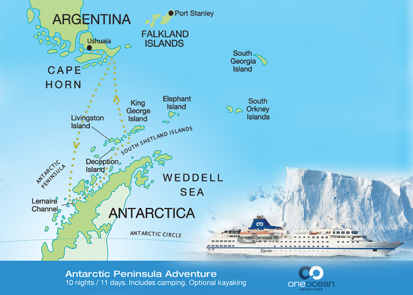 穿越德雷克海峽後,接連的6天,我們將尋幽訪勝,巡航於這生物繁盛、冰河冰山四處環繞、人文歷史史蹟豐富及奇觀美景處處可見的純美大地。船長及工作人員將仔細監察研究每日情況,根據當時的天氣狀況彈性安排每日航程,預計由以下區域挑選最適當的地點搭乘橡皮艇登陸或巡航: